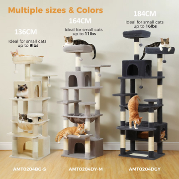 Tilgjengelig i flere størrelser, den er perfekt for 4–5 katter som elsker å klatre opp og ned, klø seg og sove sammen. Den brede hengekøyen og den ekstra store rektangulære leiligheten er større enn de vanlige - god plass til å sitte side ved side.