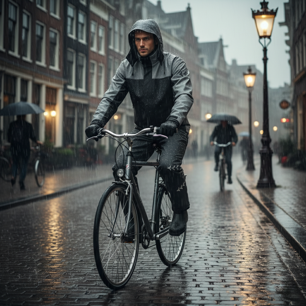 Dette lette settet er designet eksklusivt for menn, og pakkes inn i sin egen oppbevaringspose for enkel transport. Refleksdetaljer og et stille, fleksibelt stoff sørger for sikkerhet og komfort enten du sykler gjennom bygater eller utforsker tøffe stier.