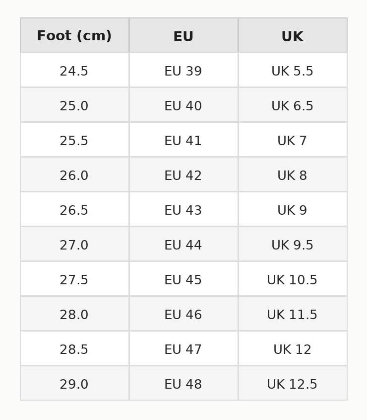 Før du velger din New Fast™, sjekk nøye tabellen nedenfor og mål foten med en linjal eller målebånd. Sammenlign lengden i centimeter (CM) med størrelsestabellen for å sikre perfekt passform og unngå feil.